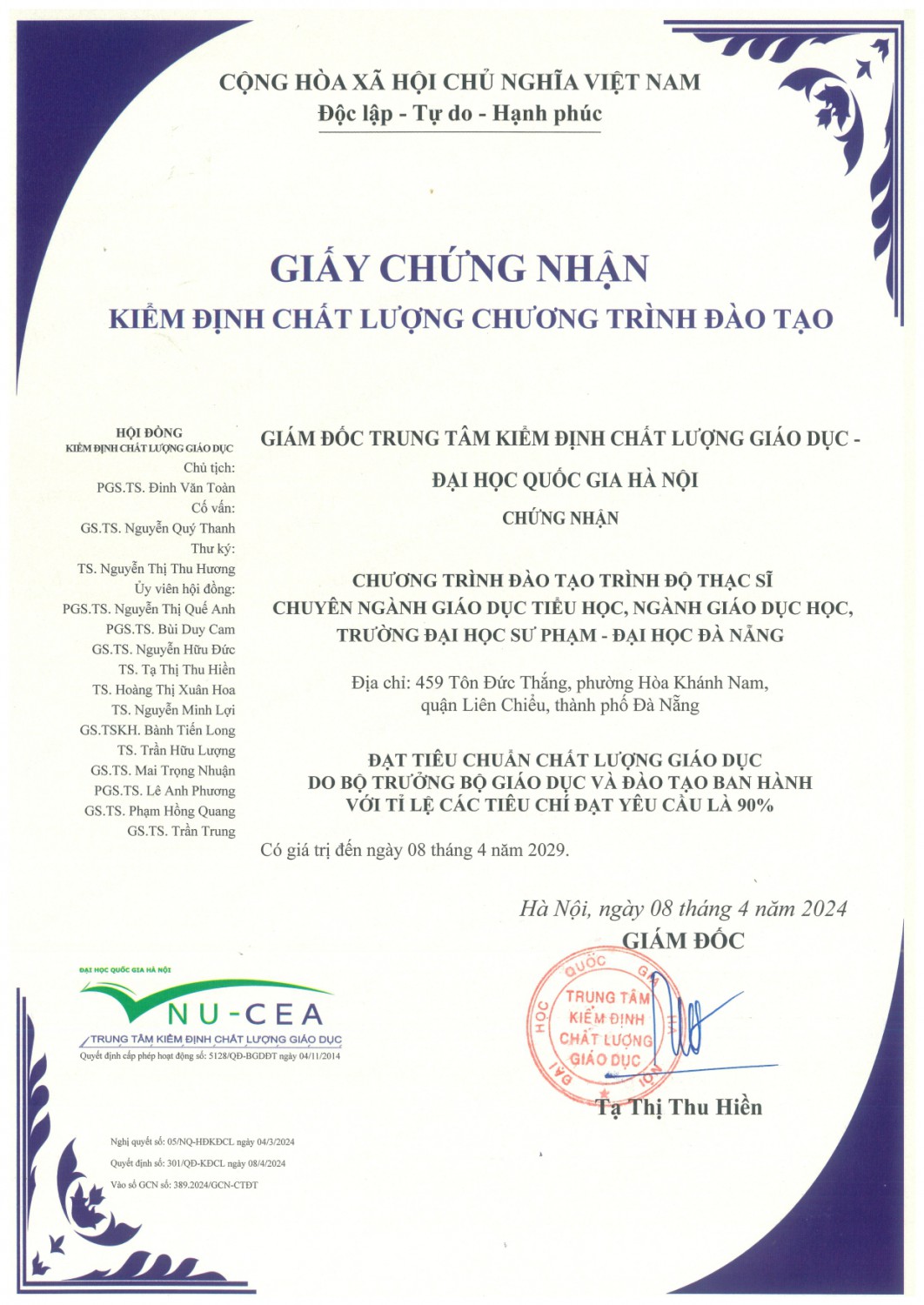 Ngày 24 tháng 4 năm 2024, Khoa GDTH - Trường Đại học Sư phạm Đà Nẵng đón nhận Chứng nhận đạt chuẩn chất lượng giáo dục Quốc gia cho Chương trình đào tạo thạc sĩ chuyên ngành Giáo dục tiểu học, ngành giáo dục học. CTĐT đã được kiểm định khách quan theo các quy định, tiêu chí của Bộ Giáo dục và Đào tạo, được đánh giá cao bởi các chuyên gia uy tín của Đoàn đánh giá ngoài. Đây là sự thể hiện trách nhiệm xã hội và cam kết với người học và các bên liên quan trong thực thi công tác đảm bảo chất lượng, một trong những yếu tố cốt lõi đối với một cơ sở giáo dục ĐH để phát triển bền vững.